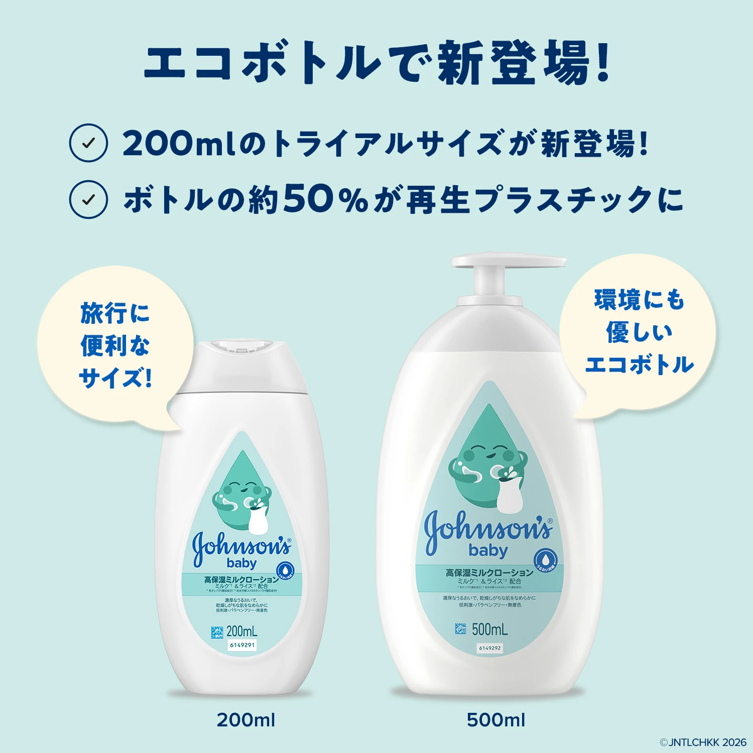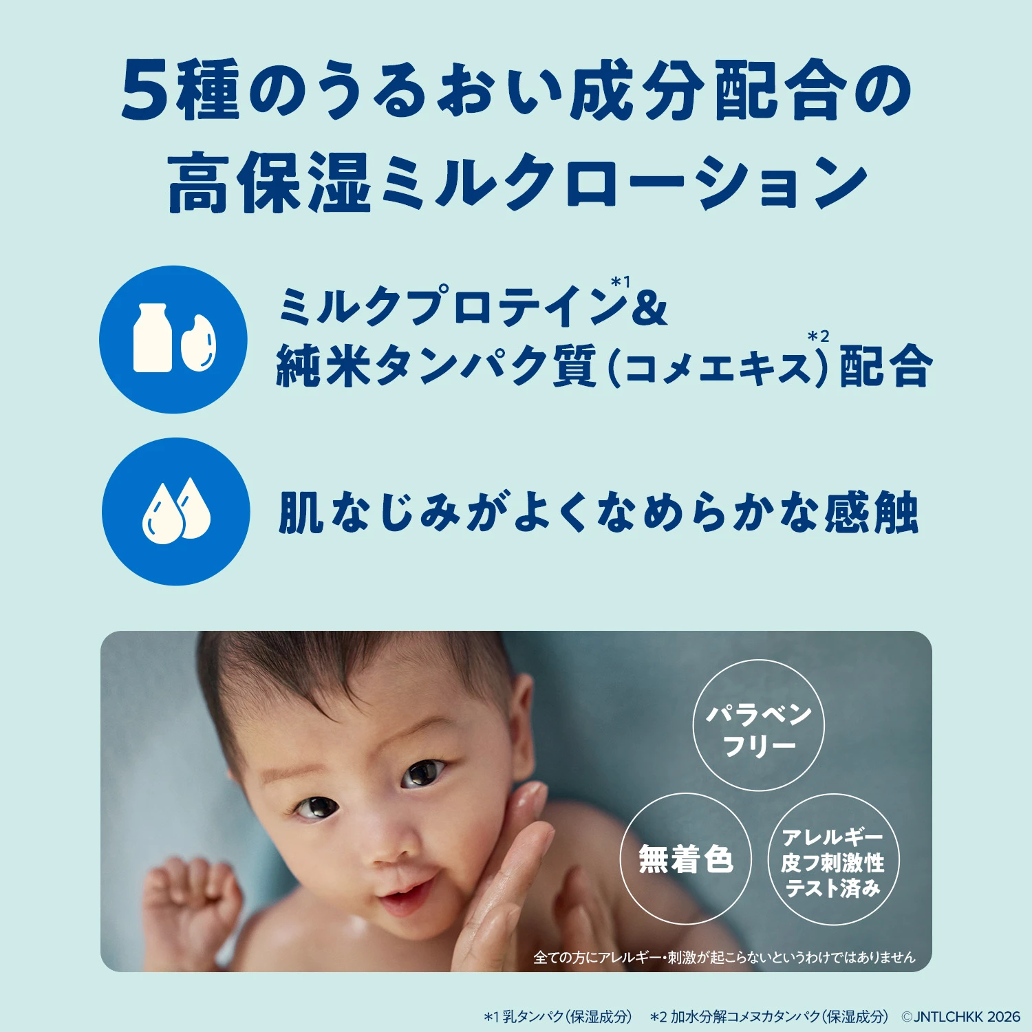 *1 当社従来品ジョンソン®ベビーローション比*2 乳タンパク(保湿・整肌)、加水分解コメヌカタンパク(保湿・整肌)、アスコルビルリン酸Na(整肌)、パンテノール(保湿・整肌)、酢酸トコフェロール(整肌)