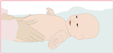 赤ちゃんの腕を、胸のところで腕の上下を入れ替えながら、3回クロスさせます。それから、やさしく腕を横に広げます。言葉は、「クロス クロス クロス オープン」です。繰り返します。